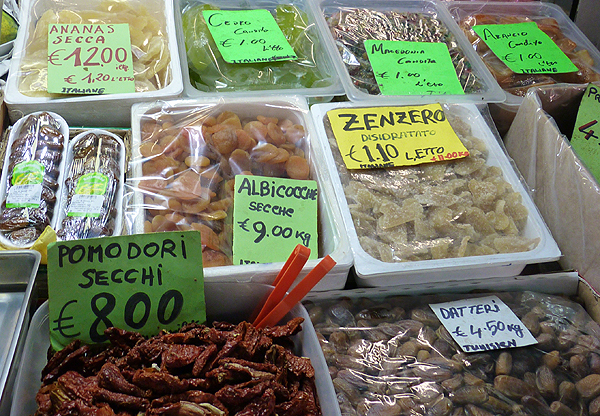 It’s a shame because the market in San Giovanni di Dio square it’s an interesting place, where traditional stalls live together with funny characters, typically Roman (Marco for example, aka Marchese del Grillo – literally cricket marquise – “because I laugh, joke and make fun of everyone”); farmers bringing their fruits and vegetables from Maccarese ('Riccardo and Valentina, fresh and genuine vegetables), Cerveteri, Sezze and Latina; bakers; butchers and fishmongers; baked products stalls from Castelli areas (cookies, doughnuts, jams) and exotic vegetables for recipes from all around the world. But also clothes, linen, shoes and even jewelry stalls.